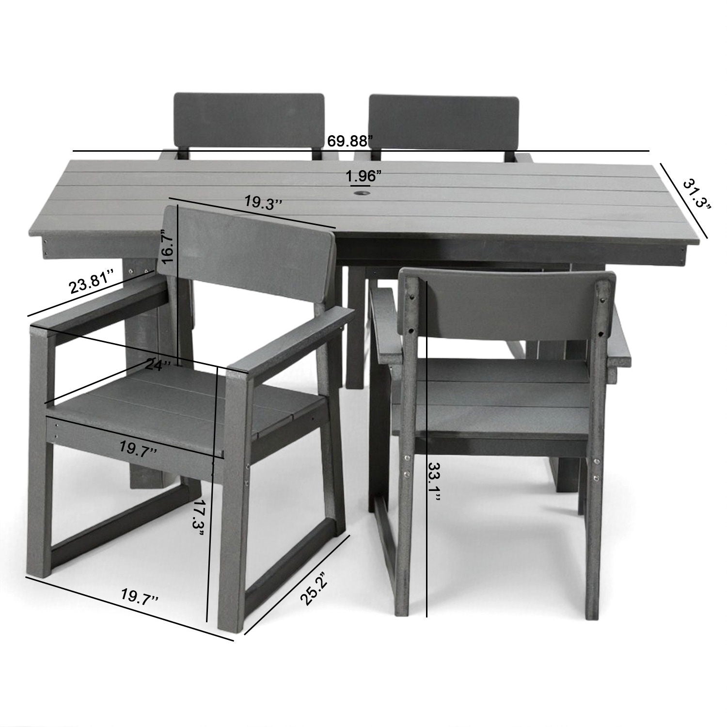 5 Piece Outdoor Dining Set For 4, Patio Table With Umbrella Hole And 4 Armrest Chairs For Backyard - Gray