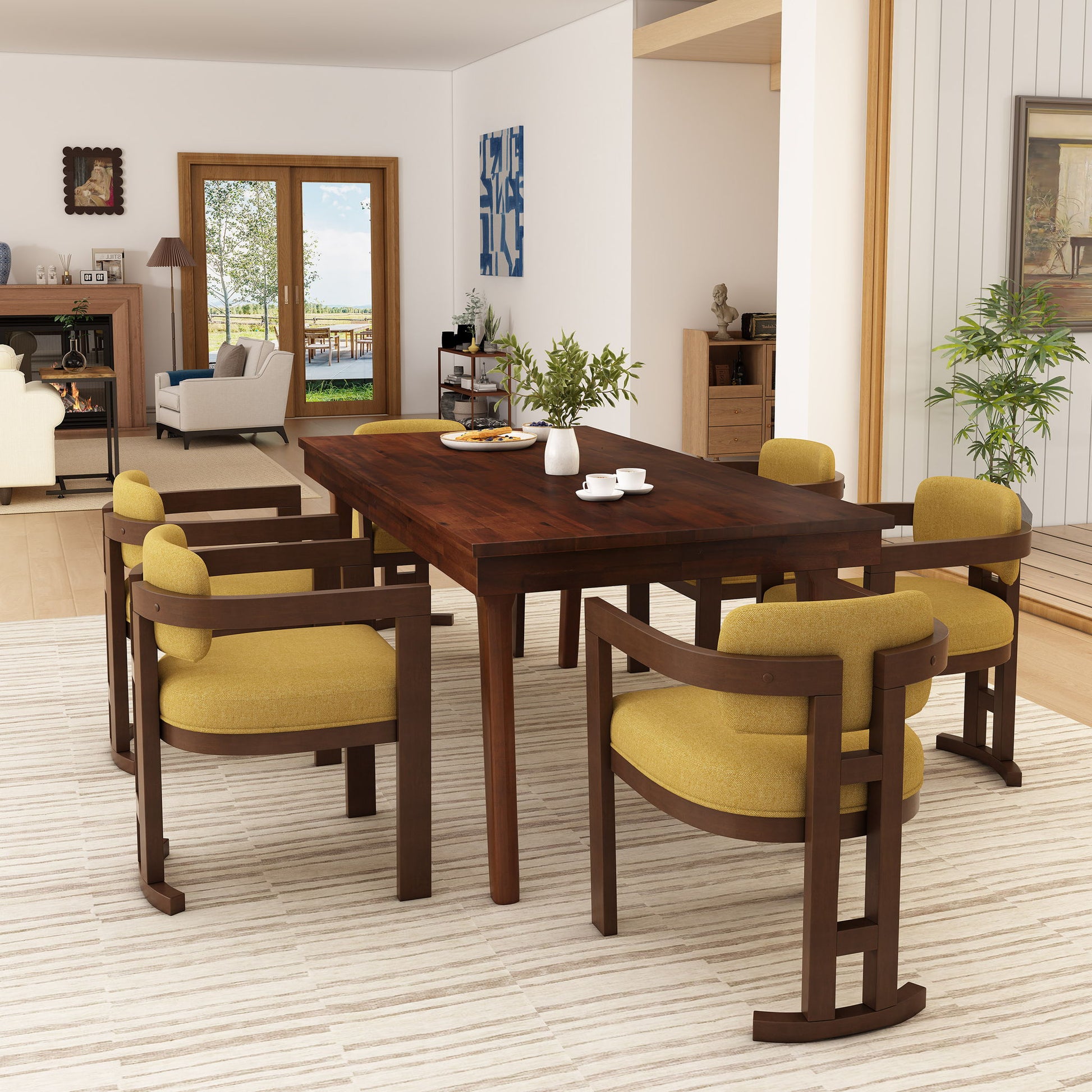 7 Piece Elegant Dining Set With Upholstered Wood Dining Chairs - Yellow / Walnut / Rich Mahogany