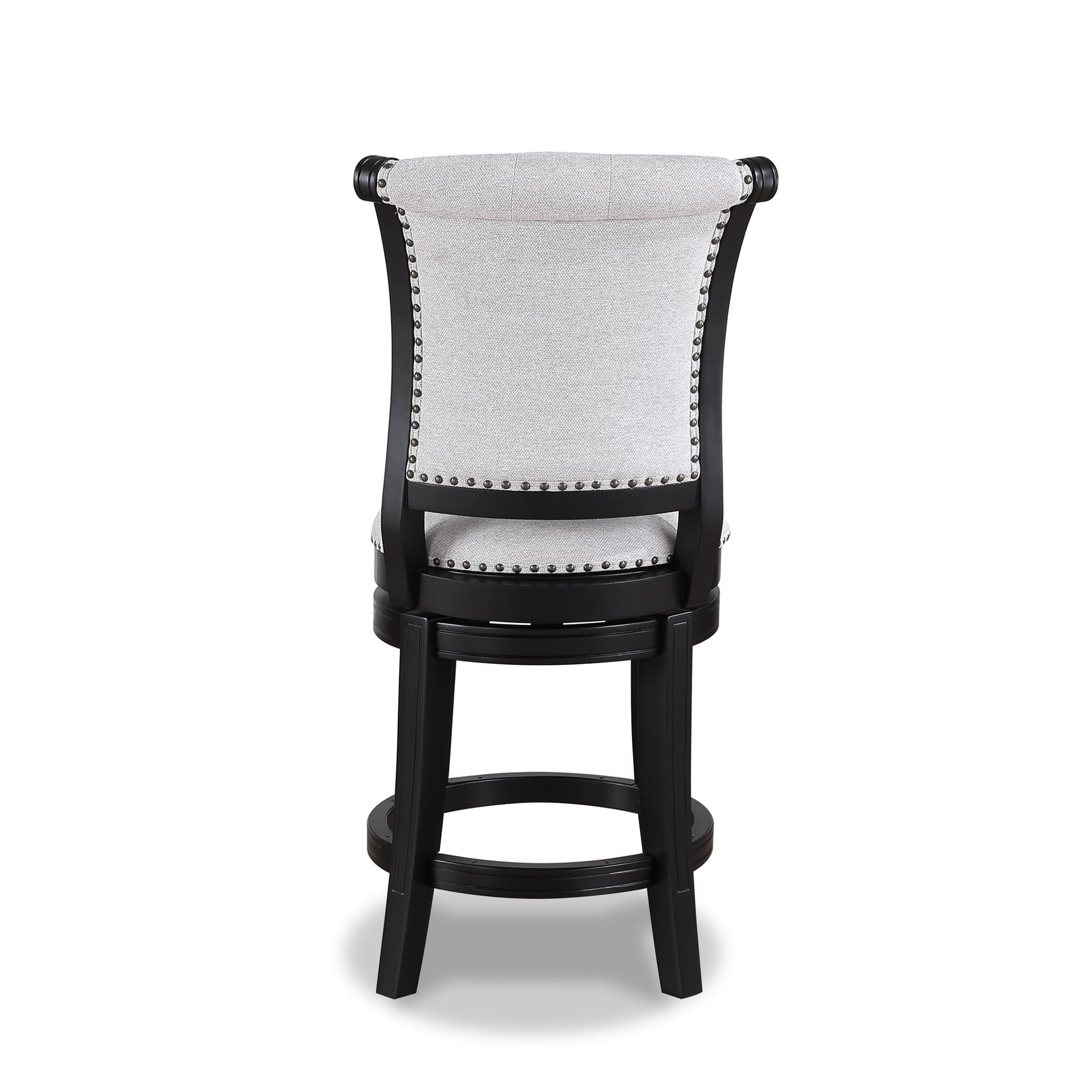 The Granville Swivel stool is beautifully crafted. With a button tufted full height back, nail head trim detail, and cushioned upholstered seat, it provides a classic look that adds a touch of sophistication to your space. Upholstered in a rich espresso vinyl, it is not only visually appealing but easy to care for. A 180 degree swivel and wood footrest offer accessibility and comfort. Full assembly required.
