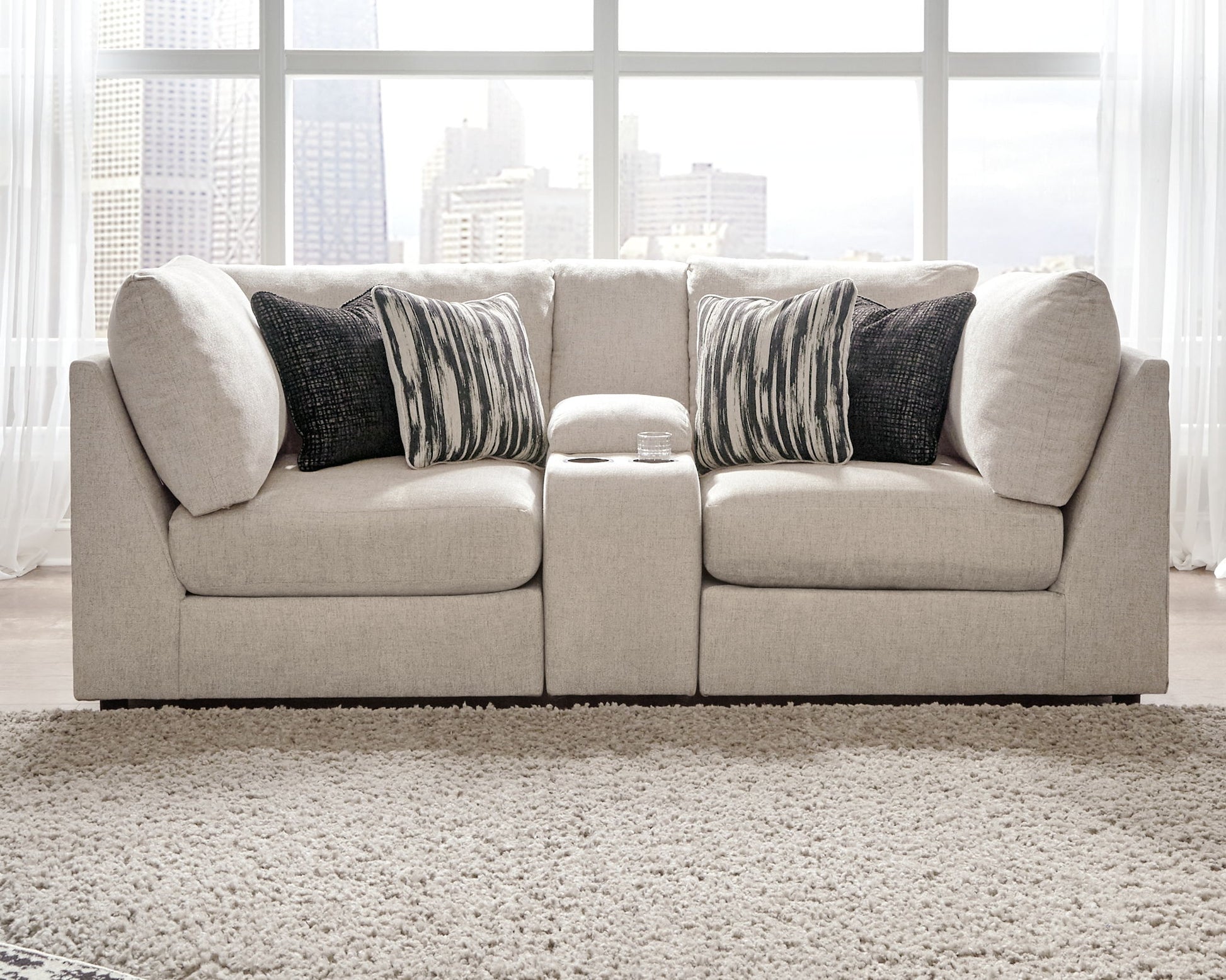 With its casual-contemporary aesthetic and modular design, the Kellway sectional makes way for high style and indulgent comfort. Rest assured, the thickly cushioned storage console includes not only a pair of cup holders, but also a USB port to keep you powered up while you unplug. Wedge-cut armrests are right on point for those who fancy a clean, modern look. Plush-to-the-touch chenille-feel upholstery in bisque beige is pure delight.