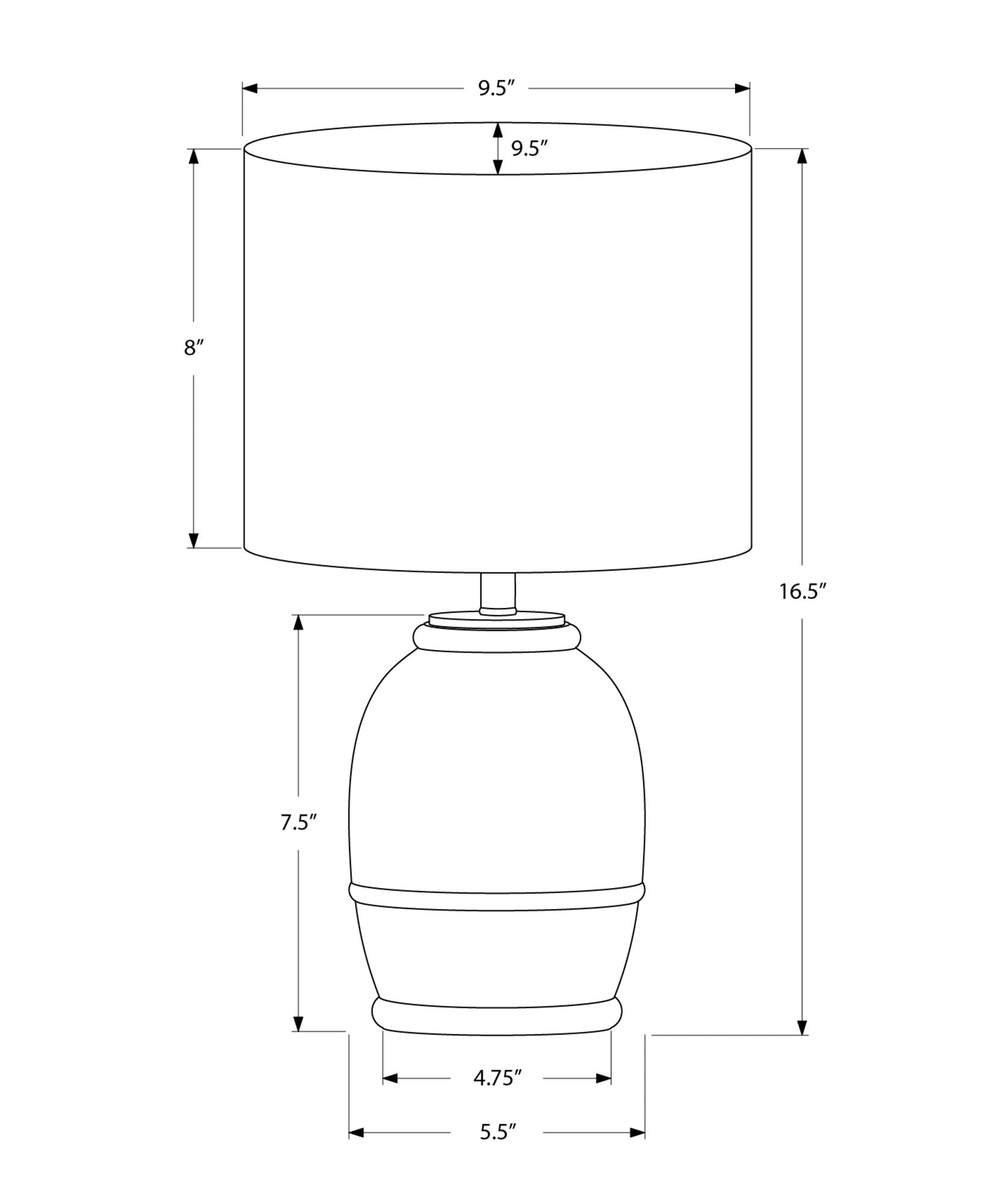 - Dimensions: Measures 9.5 in. L x 9.5 in. W x 16.5 in. H, with a base of 5.5 in. L x 5.5 in. W x 7.5 in. H and a beige shade of 9.5 in. L x 9.5 in. W x 8 in. H.