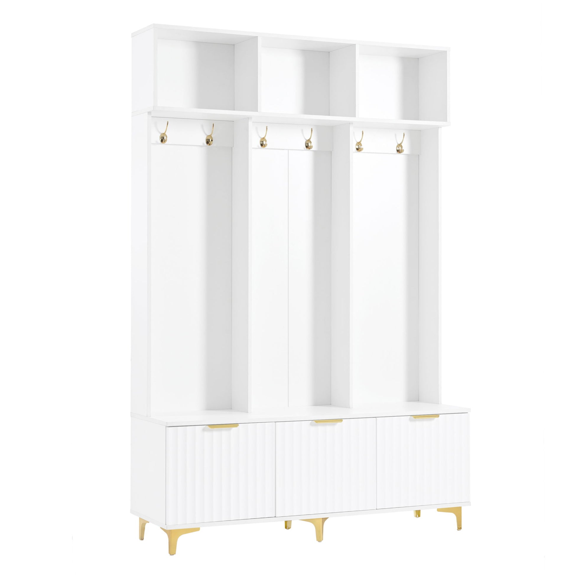 - Modern Luxurious Design: This hall tree is a bright and glamorous storage cabinet with high gloss fluted textured doors, paired with shiny golden hooks, handles and legs. Its modern and elegant appearance design will enhance your decorative style.