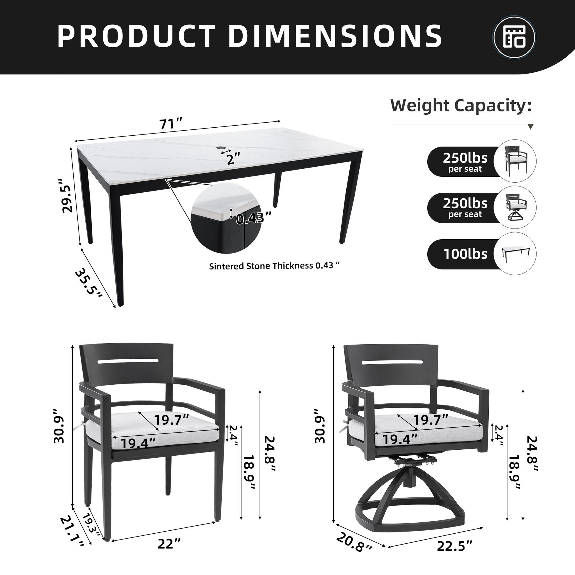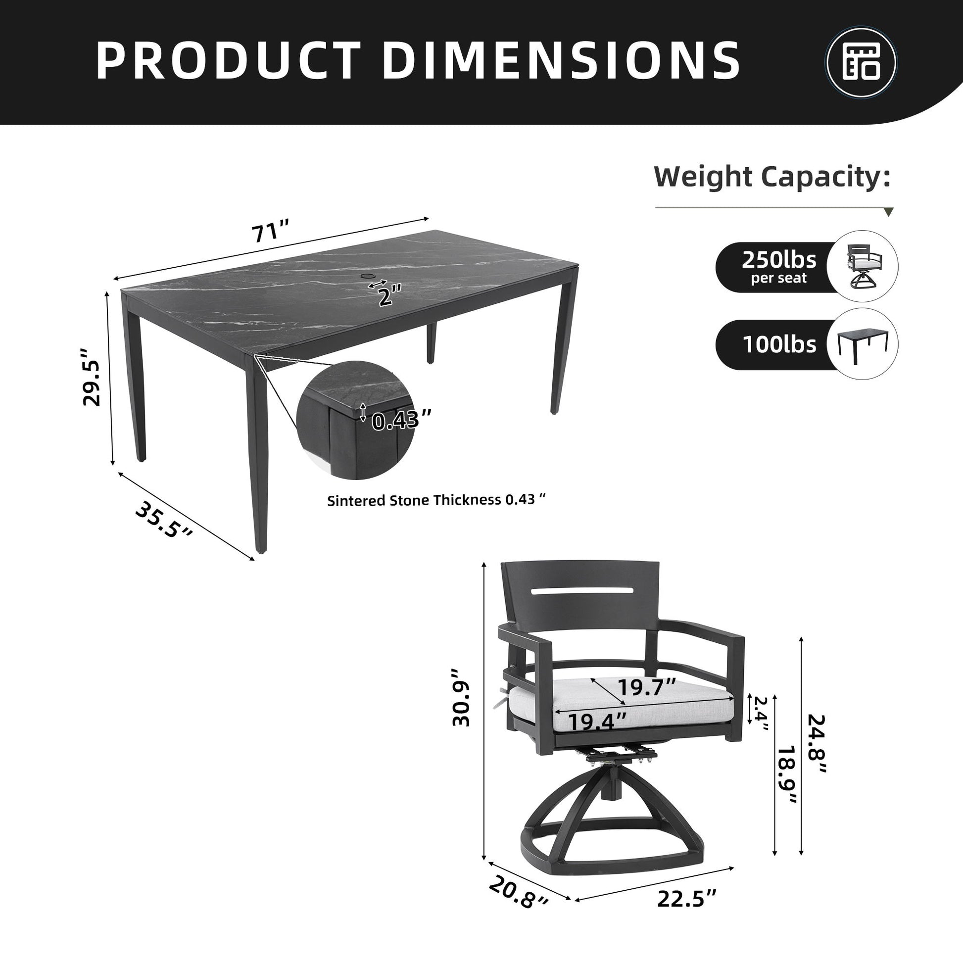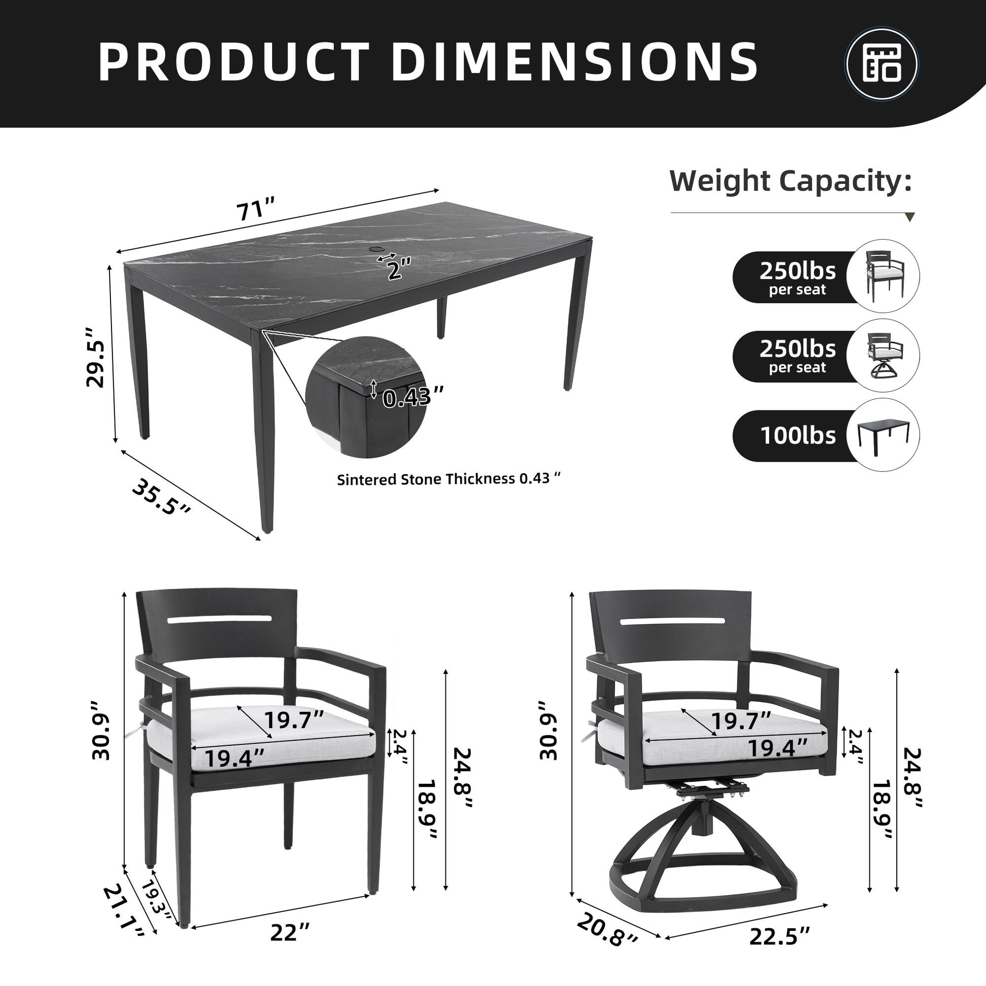 - Dining Set:Includes a rectangular table with a marble-inspired sintered stone top and 6 swivel rockers.