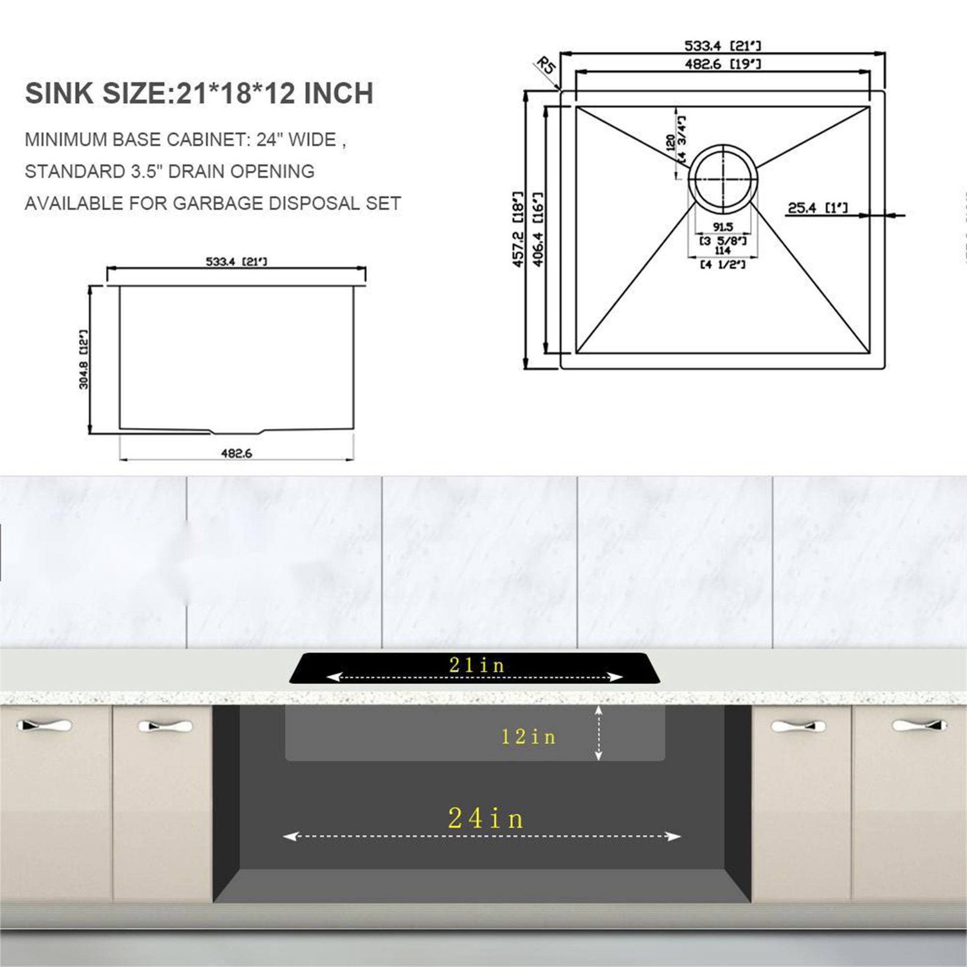 21" Undermount Stainless Steel Kitchen Sink 16 Gauge With 9" Deep Single Bowl - Brushed Nickel
