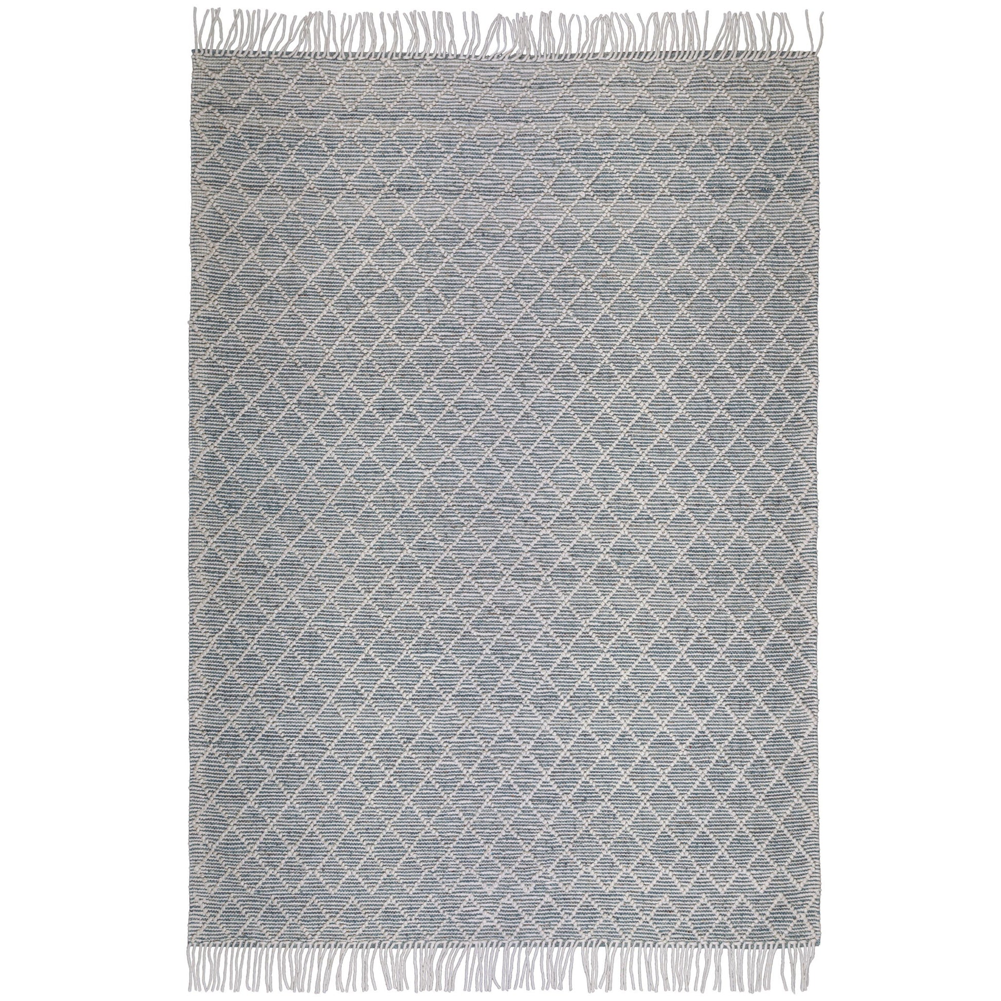 - Detailed with a diamond pattern invory and teal featuring a hand-knotted fringe