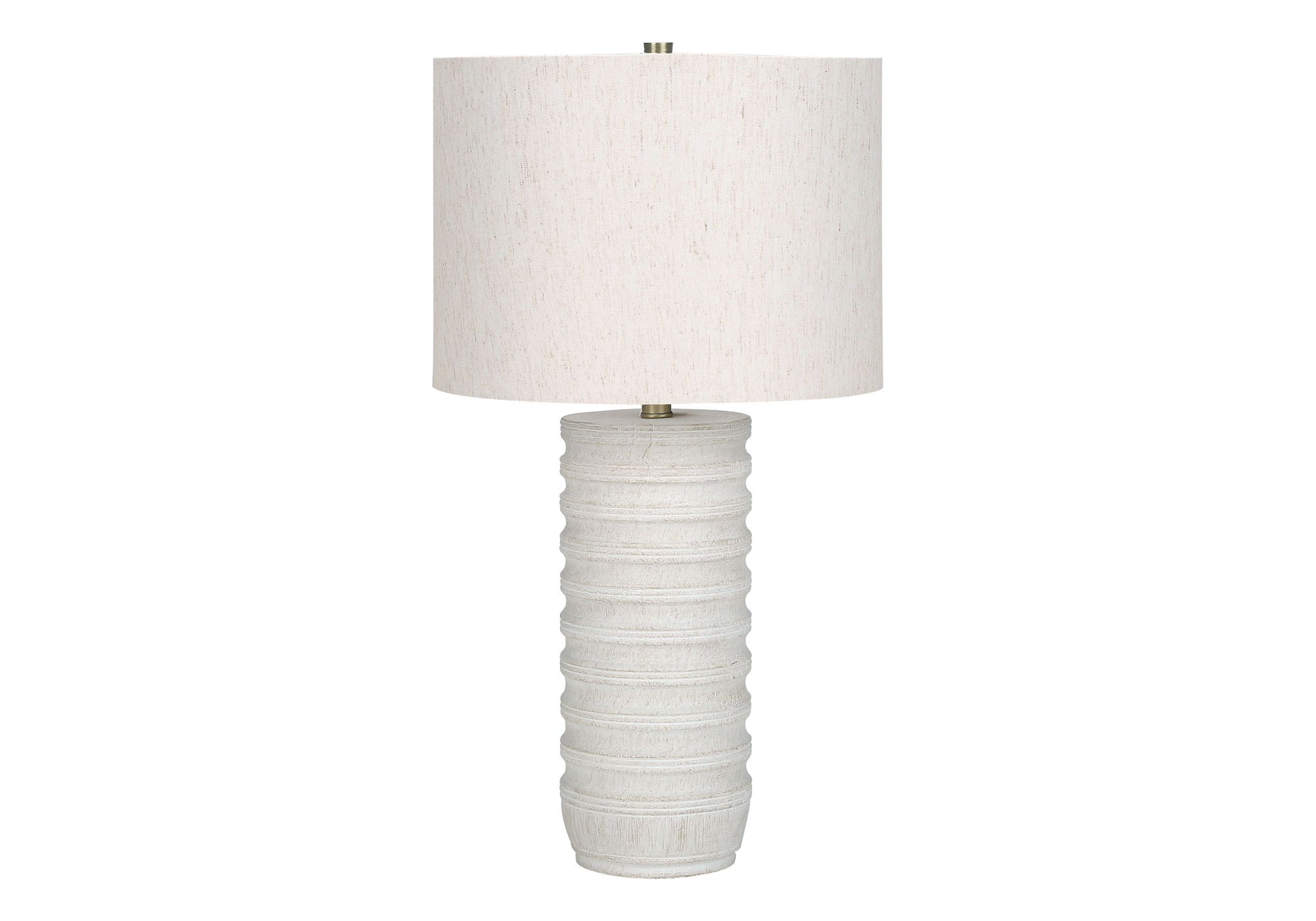- Stylish Design: This 28" cylinder-shaped table lamp features a cream resin base with a ridged design and an ivory linen fabric drum shade, topped with a chic gold finial, making it a fashionable addition to any room.